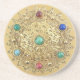 Rund sandsten underlägg av en guld-medallion med jade, blå safir, ruby och andra oidentifierade halvädelstenar. Se hela Gemstones & Medallions Underlägg samling i HEMMA-sektionen.
