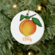 Lägg en varm suddig känsla i extra till Julgran eller till vilket rum som helst under hela året genom att dekorera med denna utsökta juicefärgade prydnadsämne. Juicy Peach är en originalillustration som skapas av Debi Payne Design. Med sin vackra blandning av färg ger den en bild av naturaliteten hos en riktig persika. Dess färskhet framgår av en bruna ånga och grönt löv ge ett intryck av att den goda frukten just har plockats färsk från träd som ger bra och mat. Med den här fina Juicy Peach-designen kan du skapa din egen anpassningsbar genom att lägga till ditt namn eller valfritt meddelande.