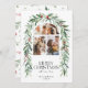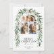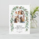 Julfoto Collage Botanical Helgdag Card. Vackra julkort med en båge med tre foton parade med riktiga handmålade röda bär och vinterkrans med gröna bågar. Löv och bär den botaniska julen mönster längst bak i inbjudan.