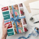 Fira julhelgen med denna moderna, personlig inslagna papper. Presentfigursättning ger plats för fem av dina favoritfoton i familjen. Det finns också ett område med blå tealbakgrund och hälsning God jul (som kan redigeras) och din familj namn. Foton, hälsning och namn repeterar i ett sött mönster för ett vackert festligt utseende.