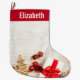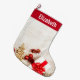 Julstrumpa personlig med namn. Ett strålande foto. En ljusbrun träbräda med olika inslag vid jul längs grund.