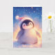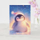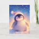En fluffy baby penguin står glatt i snö och bär en fin röd julhatt med vit päls-trim. Penguins mjuka, runda drag och rosyska kinder utstrålar värme mot coolans vinterbakgrund. Väntande ljus och mjukt fallande snöflingor skapar en magisk atmosfär som belyser området med gyllene och blå nyanser. Pingvinets ljusa, mousserande ögon och milda leende fångar julhelgens anda, skapar detta som en hjärtslitande vinter-illustration.