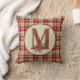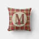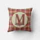 Festlig kastkudde med en rutig bakgrund med rustik utfylld trädgårdsmonogram bokstav M och vattenfärg poinsettia blomsterdekoration. Landsbygdens julfärgspalett.