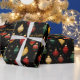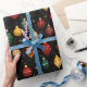 En ljus, färgstark julomslutning med papper design av glanliga träd-dekorationer ljusa färger om guld röd och blå allt på en svart bakgrund. Ordalydelsen "God jul" i guld färgad kan anpassas efter behov med alla hälsning eller anpassas efter namn.