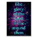'Herrens härlighet lyste omkring dem' Lukas 2:9 Bibelverscitat med abstrakt konst typografi i blå, svart, orange, lila och rosa stjärna skapad med akvarellfärg. Kristen religiös typografiillustration skapad av konstnären Catherine Sweetman med akryl bläck.