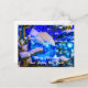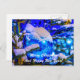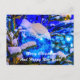 Upplyst Julgran, grönt nål och blått ornament boll täckt med kopp i färskt snö. Smakfull och glatt stämning. Text God jul och Gott nytt år. Horisontalorienterat vykort. Du kan ändra eller ta bort bilden och texten.