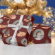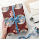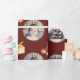 Festive julafton botanical design med gyllene cirkelfoto ram. Mörk röd bakgrund med vattenfärg träd och inslagna presenter.