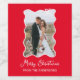 De här vackra vin-etiketterna innehåller ditt favoritfoto i ett trendig, vitt vågigt ram med en viskbuk, på en fin röd bakgrund. Modern manus säger "God jul".