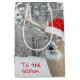 Stor buck hjort med Jultomten hatt i vinterskogen med snöflingor. Text kan redigeras.