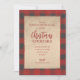 Julinbjudan innehåller dina evenemangsuppgifter på guld under en julröd jul och grått buffalo plaid mönster. MATCHING-objekt i vår samling.
