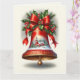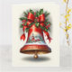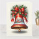 En rikligt dekorerad julklocka, komplett med ett saftigt rött band och kvistar av järnek, ramar in en pittoresk vinterscen från en by. Den snötäckta kyrkan och husen frammanar en känsla av nostalgi, medan de lätt fallande snöflingorna bidrar till den magiska atmosfären.
