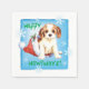 Fira julhelgen med en söt Cavalier Kung Charles Spaniel-valpen sitta i en julhatt mitt i snöflingor och ord, Lycklig Howlidays!