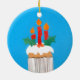 En julprydnad med en cupkaka på vardera sidan. Den vita frosten är täckt med en sprit av holly och tre festive Red Candles och kommer från en handmålad papper kollagedesign av Judy Adamson. Kaffe koppar och julkort med denna utformning finns också tillgängliga.