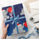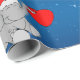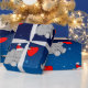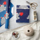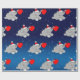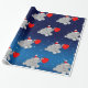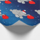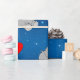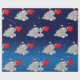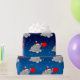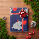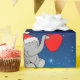 Cute elephant med röd hatt och väska med julklappar över blå bakgrund med vit snöflingor