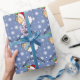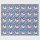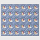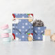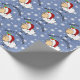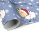 Sött tecknat luddigt vitt får med grå öron och ett rosa glatt ansikte. Han bär en klarröd tomtehatt med vit trimning och en vit pompom. Ovanför honom i svart bokstavsformulär står orden "God Jul". Detta är en mall så att du kan lämna den som den är, ändra till ditt eget meddelande eller ta bort för att lämna tomt. Bakgrunden är blå prickad med snöflingor