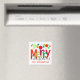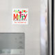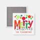 Den färglösa designen på den här festmagneten har texten "God jul" i modern typografi med en familj namn nedan som du kan anpassa dig till. Bakgrunden är dekorerad med polka dots i ljusa skuggor av rött, grönt och orange. Designad av artist © Tim Coffey