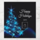 En trendig och modern jul, firande vinsetikett i svart, blå och vit för ett företag. Ett svart bakgrund med ett lysande blått julgran dekorerat med stjärnor. Med texten: God Jul skriven med modern stor vit handskriven stilspråk, vita bokstäver. Mallar för din logotyp och ett år. Perfekt som en gåva till dina lojala kunder eller anställda