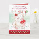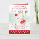 En söt liten flicka kramar en stor nalle på det här mycket söta julkortet. Teddy har en liten julhatt och flickan har en stor röd båge i håret. Ljud i rött och grönt på ett vitt kort som dekorerats med gryga och små stjärnor och en röd dekorativ panel som löper längs grund.
