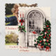 Gammaldags julkort med en scen av ett julträd, levande ljus och snöig natt på framsidan. Ditt eget foto och personlig hälsning på baksidan.