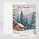 Njut av lite rustik land stil med detta festliga helgdag-kort. Konstruktionen är på en vinterscen i snö med berg och gräs träd, med en mysigt trästuga som är fastgjord på högsidan. Med "God jul in skript typography" i hälsning kan kortet vara personlig med ditt eller dina namn eller annan text.