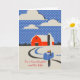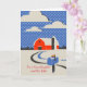 Julhälsningskort för en barndotter och barndotter enligt lag. Postlåda med regnbåge, en flagga och en röd lada är täckt med snö. Illustration av snö i himmel med puffa moln, feta grafiska former och färg. Art, bild och versell copyright © Shoaff Ballanger Studios.