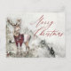 Med en luft av julmagi har det här roliga julkortet en vacker vintervattenfärgsscen i snö med en hjort som bär en varm ylle ut i kallet. Det ser ut som om han firar julen i vilden med en trädgård av poinsettias runt nacke. Fir träd prickar snöbergslandskapet i denna charmerande vinterscen. Ett tunt skript av typen ansikte spådomar ut "God jul" i kranbärrött med ett utseende på vintagens handstil. För enkelhetens skull kan en exempeltextmall på baksidan av kortet vara personlig med returadressen, önskad Julhälsningar och ditt eller dina namn.
