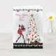 Modern julkort till en kära systerdotter, med en stilfull dam iklädd rött med klackskor som bär presenter mot ett vackert vitt dekorerat julgran. Grafik courtesy av Crave Designs.