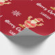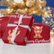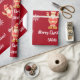 Modern julklapp i för barn, med en minimalistisk utformning som omfattar ett gingerbröd figur i Santa, snöflingor, hälsning i "God jul" i snyggt typografi och en personlig namn. På Julafton röd bakgrund.