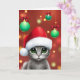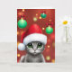 En söt grått-katt som bär en julhatt omgiven av gröntens julprydnadsföremål, skapande ett festligt och glatt "Happiest of Helgdagars"-kort.