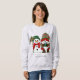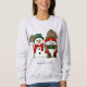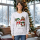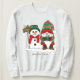En söt julgrav i rött, grönt och vitt som håller en mugg av hett choklad står bredvid ett snögubbe med ett Glad helg-tecken bredvid dem som bär en röd halsduk och mörk grönt hatt.