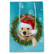 Kute, gyllene husdjur, hund i julkransarna gräs med gingham-båge och glödande ljussträng. Bakgrunden är en abstrakt turkos och vit bokeh mönster.