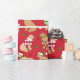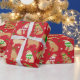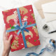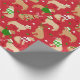 God jul i hundar i festliga helgdag. Golden Retriever med lätt och medelstor gyllene jackar bära Santa Hats, antlers, svettare på röd bakgrund med utspridda prydnadsföremål.