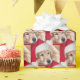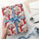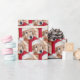 Golden-hämtare som sätter på ett träskal i golv med rött och vitt Jultomten.