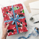 Cute Gräns Collie hundar i festliga helgdag som bär julhattar, antlers, strängar av ljus och polka punkt- och glasyrtröjor på röd bakgrund med utspridda prydnadsföremål.
