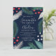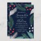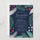 Modern målad julbröllopsinbjudan illustrerar mönster i grönt och traditionell rött med vattenfärgsfolie silver faux foil och gouache gräs träd grenar och rödbär mistletoe och faux silver folie på den redbara marblått.