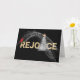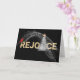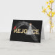 Abstraktens gnistrande ljus med röd kardinal, helgdag vit träd och guld REJOICE-text på svart bakgrund inför jul. Inre text kan ändras.