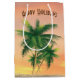 Tropiskt handflatan träd i strandsand med solnedgång himlar.