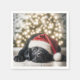 En svart labrador Retriever som bär en julhatt ljuger på ett golv av trä med ett vackert dimmigt Julgran-glödande i bakgrunden