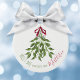 Cute Merry Mistletoe Helgdag Julfoto Ornament. Personlig med eget namn. Ett trendig sött julklapp till helgdag. Ett underbart sätt att fira helgdagarna. Den här designen har en snygg, snygg mistletoe, modern grönt för elegant och röd, enkel, grundläggande, klassisk traditionell helgdag, grönaktig, botanisk grönt-löv, med vattenfärgat rött band, modern och minimal helgdag, teckningar av laura Lacina, en helgdag julfotoornament, ett sött kalligrafiskt skript typsnitt
