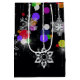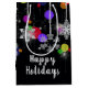Helgdag silver snöflingor i svart med färgstark bokeh ljus och rinestoner. Text kan redigeras eller tas bort.