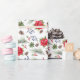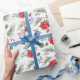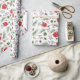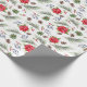 Ett dekorativt omslag pappert för julens julhelg med handmålade botaniska vattenfärgade illustrationer av poinsettiblommor, vintergröna, gräs-koner och grenar och bär av skarpsill.