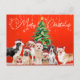 Ljus jul- eller julsäljande vykort med en samling hundar som bär röda näsor och tomtehattar.