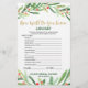 Den här julklappen "vad som finns i din väska" är perfekt för en vintermöhippa. Spelkortets framsida har "hur bra du känner till bruden" och kortets baksida innehåller "vad som finns i din handväska". Utformningen har en vattenfärgad grönt med röda bär och ett elegant faux glitter-teckensnitt för guld. Anpassa kortets framsida med bridens namn och möhippans datum. Obs! Den här designen har inte guld glitter. Det är en högkvalitativ grafik som framstår som en högkvalitativ gnistra i guld.