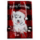 Husky hund med julklappen Jultomten på röd och svart buffel pläderad bakgrund och snöflingor. Text kan ändras eller tas bort.