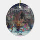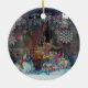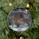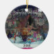 Söt butiksfönster i staden i vintertid med träd, snöflingor och figur, status- och isfärdsscen med barn och vuxnor som har roligt. Originalfotografi av TamiraZDesign.