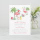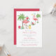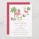 Jul i July-festinbjudan med två flamingos och handflatan träd med gåvor som är helt färgade, idealiska för inbjudan dina vänner till din speciella julklapp party.