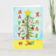 Det här söta vykortet, som ritas i en tecknad stil och färgad i vattenfärger, visar två små koala-björnar som hänger i en julgran med tre röda balkar och en stor gult stjärna. På den lämnat sidan av träd kan du läsa ord "Lycklig" lodrätt skriven i gröntens, rödets och orangens nyanser. På högerna ord "jul", skrivet "Julafton" och grund på kortet "i juli", hela färgaden i samma stil. Träd ligger i färgadens gult. Bakgrunden är ljusblå. Där finns en snöflingor som är spridd här och där, ljugande på träd grenar och som täcker marken. Inga droppar har begärts i skapar av detta kort.