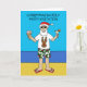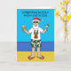 En tecknad Pappa jul som står på en strand i flinflip flops, skuggor och hollöst mönstrad kort. Orden "Juldagen i juli" följer med bilden.