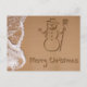 Sund julillustration med snögubbe och God jul skrivet i sanden på stranden bredvid havet.