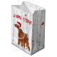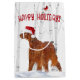 Irish setter hund bar en Jultomten hatt i snöflingor och birch träd.